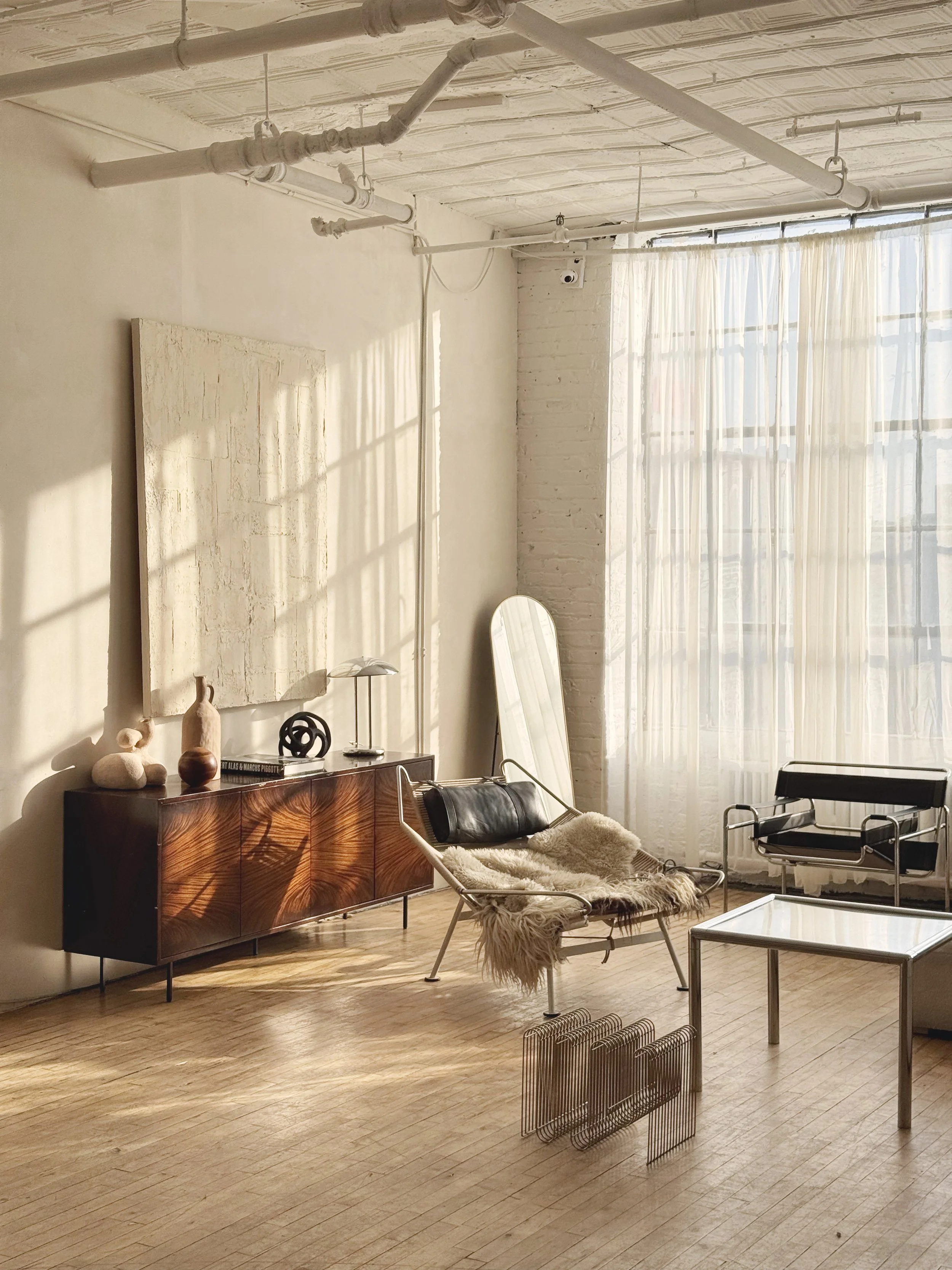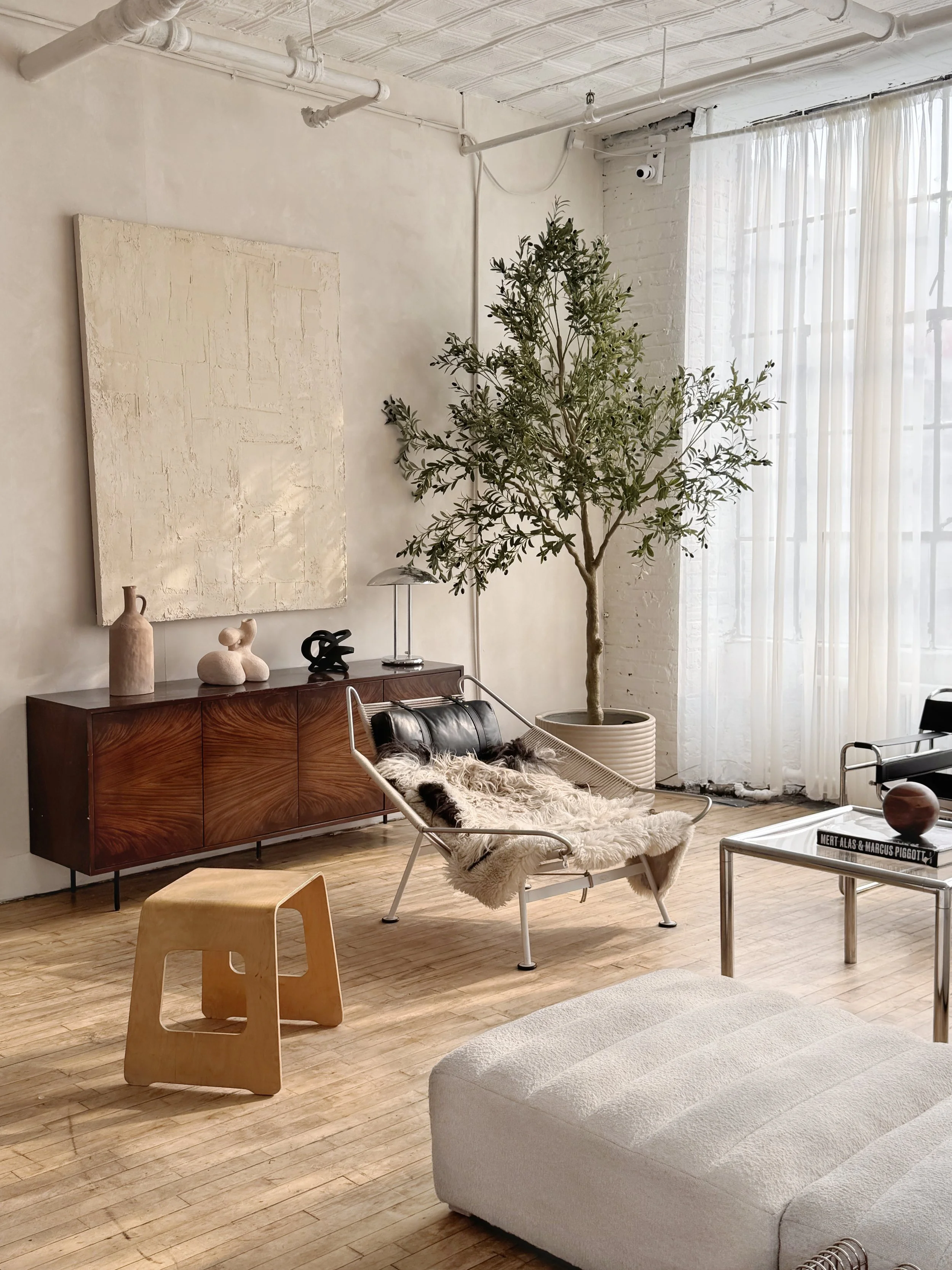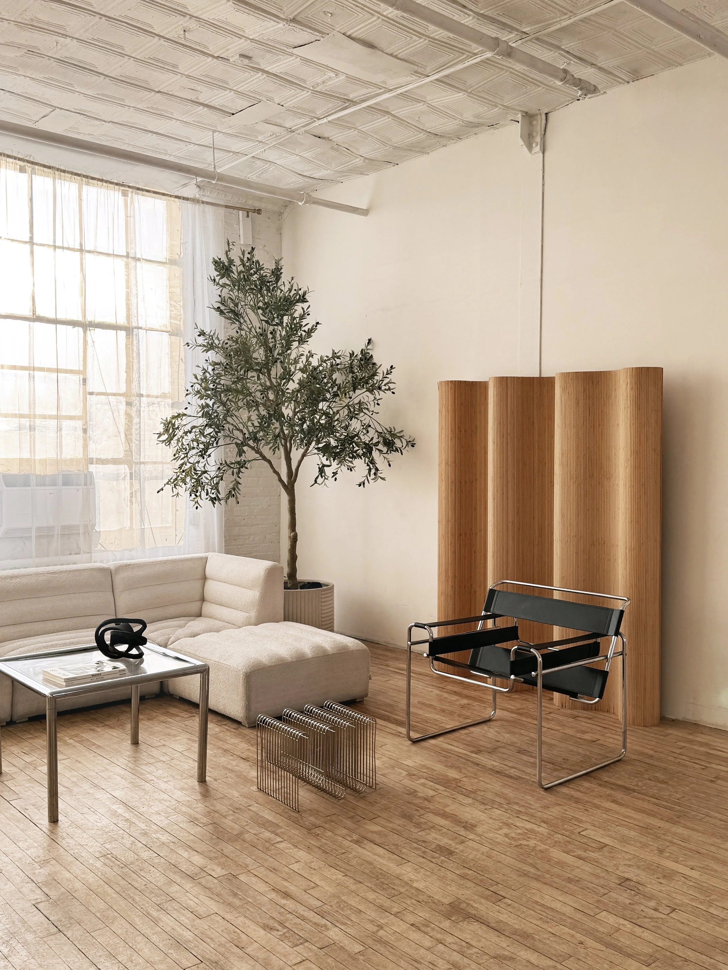 Studio 1 at STUDIO CLYX is a natural light photo and film studio in Brooklyn, NYC, available for hourly rental. Designed with a refined editorial aesthetic, it is ideal for fashion shoots, lifestyle and video content creation with its clean, minimalist design and soft earthy color tones.